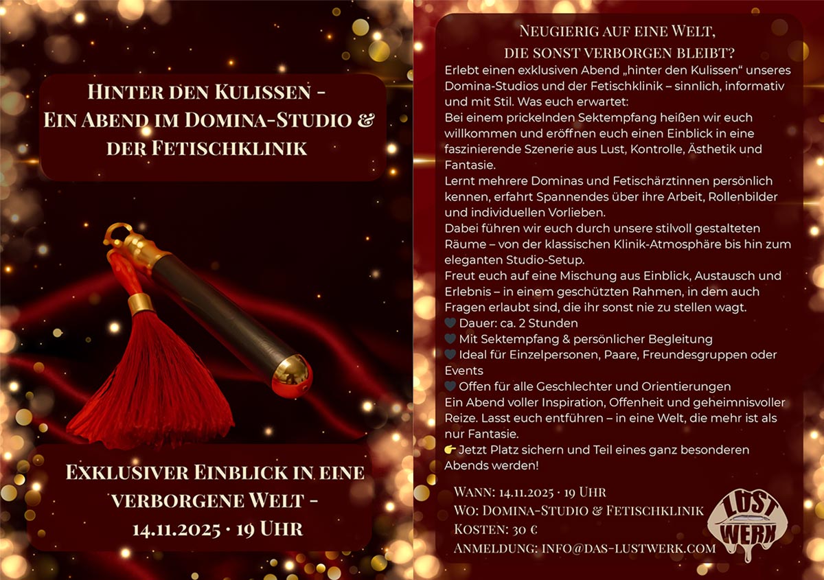 Erlebt einen exklusiven Abend „hinter den Kulissen“ unseres Domina-Studios und der Fetischklinik – sinnlich, informativ und mit Stil.